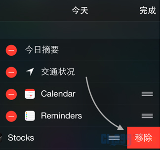 5.这里以把通知中心的股票去掉,点击 Stocks(股票)左边的减号按钮,再点击右侧的‘移除’按钮,如图所示