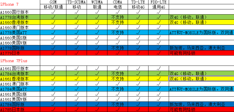 iPhone7在2016年9月隆重发布,我们先看一下我们适合购买什么版本的机器,以下是iPhone7/7Plus的网络支持情况: