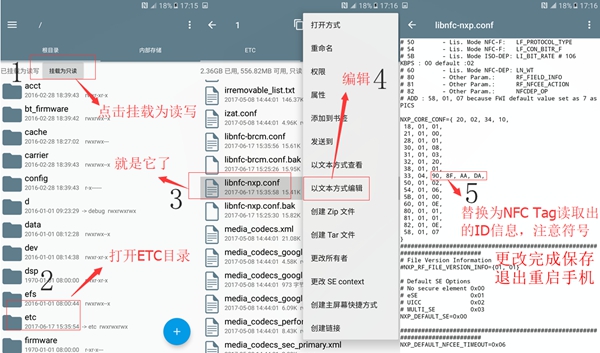 4.打开ETC目录,找到libnfc-nxp.conf,打开后编辑替换为要模拟的IC卡ID。